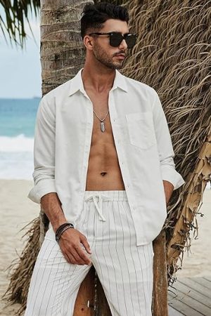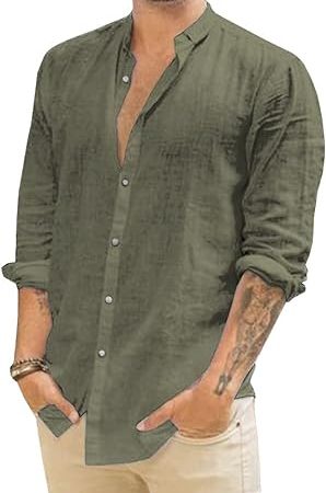 Button Down Shirts Band Collar Linen Summer Beach Shirts