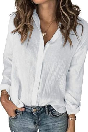 Down Cotton Linen Shirt Blouse Loose Fit Casual VNeck Tops