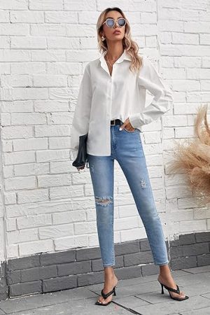 Sleeve Button Down Shirt Solid Basic Workwear Blouse Tops