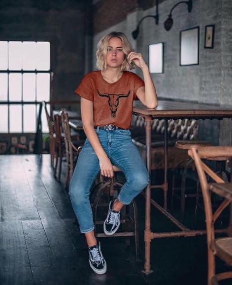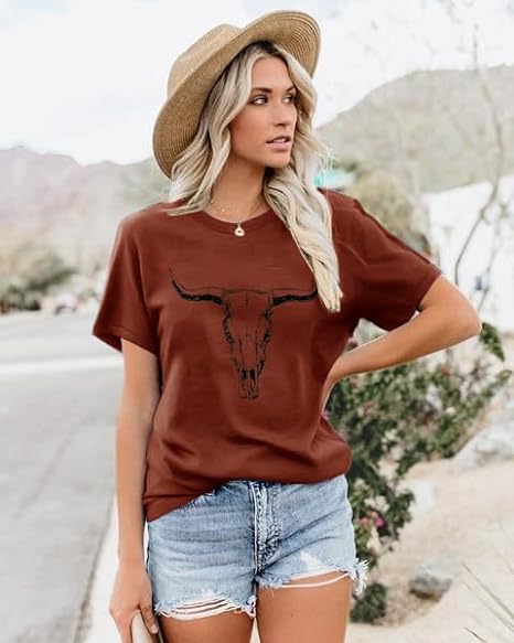 - Perfect Match: Boho cow skull t shirts for women. Complete the look with bike shorts or jeans for an on-trend look. Bull skull with horns hand drawn image for nature lovers, great for women or for cowgirls. If you tuck the shirt into your pants or tie a knot on the side, it will look very stylish and personal.